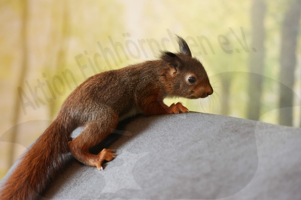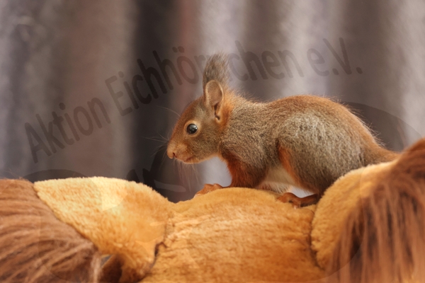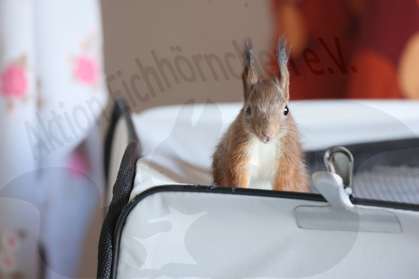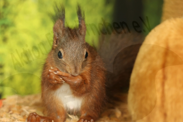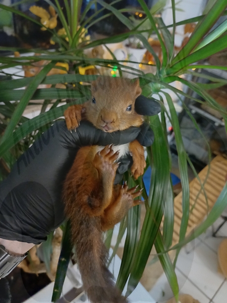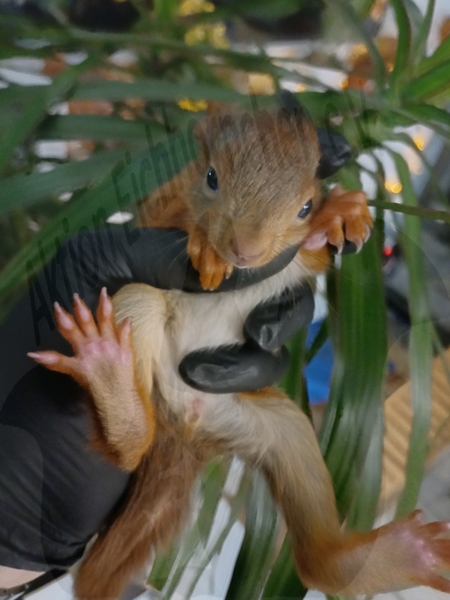 Am 05.04. 2026 kam „Frodo“ hier von Dany und Rainer aus Witten in die Station, da gibt es mittlerweile jährlich mal das ein oder andere Nothörnchen. An für sich macht er einen sehr guten Eindruck, was heißt an für sich, er macht einen guten Eindruck, super hübscher Eichkater, ca. 6 Wochen alt, schon so gut wie „Selbstversorger“. Das Problem, der Kurze ist ein bisschen unterernährt und so ängstlich, dass er schon die Milchspritze aus Angstaggression anspringt. Ihn zu füttern ist echt eine Geduldsprobe. Wiegen, keine Chance. Wenn er dann mal an die Spritze geht, dann schafft er es, zu trinken, dabei zu meckern, fauchen und zu fluchen. Stress für ihn, wie für mich. Aber er frisst und knabbert gut. Aktuell noch in einer Transportbox, das ist aber mit Sicherheit keine Dauerlösung. Er braucht auch Spielgefährten, aber dazu muss er sich „artgerecht“ benehmen, ansonsten gibt es Stress mit den „Kumpels“.