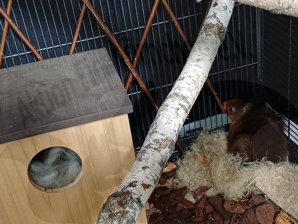 Lina? Das Problemhörnchen in der Quarantänestation. Ich habe mit der TA abgesprochen, dass wir noch bis Donnerstag abwarten. Seit ca. 2 Tagen nutzt sie den Holzkobel, der von Anfang an in der Quarantänestation stand. Vorher hat sie immer nur „daneben“ geschlafen. Sollte sich bis Donnerstag nichts an ihrem Verhalten/Aussehen ändern, werde ich sie mit dem Holzkobel in eine andere TA-Praxis mit Röntgengerät bringen und wir müssen mit Holzkobel den Status kontrollieren. Hier steht wirklich alles in den Sternen.