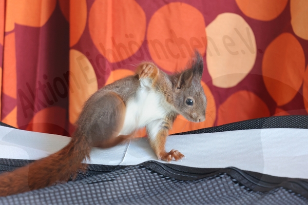 Freddy erwischte seine Finderin Katja auf der Lönsstraße, als sie zum Einkaufen gehen wollte. Katja, völlig irritiert über dieses Eichhörnchen, ging erst mal einkaufen, vielleicht war Mama ja in der Nähe. Zurück vom Einkauf, hatte sich Freddy zum Nachbarn gesellt. Klar war, da stimmt was nicht. Katja brachte mir Freddy, vielen Dank dafür. Freddy war sofort bester Freund von Sauger und Milch, sehr zuträglich, er hat Hilfe gesucht und bekommt sie jetzt. Mittlerweile ist er in die Gruppe von Fips, Speedy, Fritz und Frieda integriert, die 5 sind auch in einen kleinen Laufstall umgezogen.