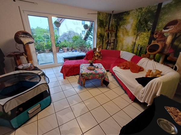 Da Jaan ja ihren bisherigen Lebensabschnittsgefährten „Löwe“ verloren hat, musste sie ein paar Tage alleine im Hörnchenzimmer zubringen. Um so mehr erfreut war sie, als das Quartett aus dem Laufstall ins Hörnchenzimmer dazu kam. Jaan überschüttet sie mit Spielaufforderungen, die dann auch gerne angenommen werden. Da ich derzeit noch viel liegend auf der Couch verbringe, gibt es auch entsprechend viele Bilder: