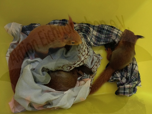 Und heute vormittag dann der Anruf aus der Inge-Donnepp-Straße in Unna, ganz in der Nähe des Südfriedhofes. 3 kleine Eichhörnchen, verwaist, Mutter nicht in Sicht. Die Gartenbaufirma hat mit Hilfe einer Anwohnerin den Verein Aktion Eichhörnchen gefunden, also nix wie hin und die 3 abgeholt. 2 Jungs, 1 Mädel, und wie heißen sie: „Inge“, „Don“ und „Nepp“ ….sind auch noch nicht wirklich „saugergängig“, finden alles doof, sitzen aber in der Transportbox bei Schnuffel, gleiches Alter … Fotos folgen …
